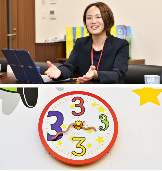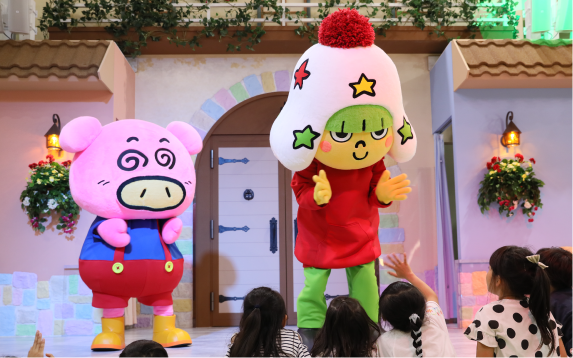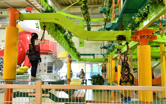 万華鏡トンネルを抜けておやつタウンの内部に入ると、天井の高い大きな空間の中にベビースターキャラクターのホシオくんの形をした巨大なすべり台が目前に迫り、その奥には屋内型で3階構造の「超ドデカイアスレチック」がそびえます。1階は身長122cm未満の方が、2・3階は身長122cm以上の大人もスリルを感じながら思いきり体を動かして遊べます。実はこのアスレチックこそ、おやつタウンのコンセプトの象徴。子どもの遊ぶ姿を親が眺めている光景も微笑ましいのですが、それよりも一緒に体験する、一緒にドキドキする方が鮮明に記憶に焼きつき、また来たいという気持ちにつながります。浦さんは「おやつタウンが提供するコンテンツは全ての親と子が一緒に遊び、学び、創れるもの。親子の楽しい会話が生まれるきっかけになればという思いが込められているんです」と言います。