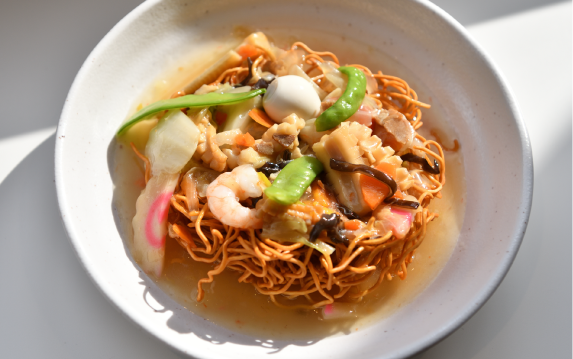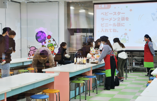 汗をかいて遊んだあとは、学んで創れるコーナーがずらり。ベビースターラーメンができあがる瞬間を間近で見学できる「ベビースターファクトリー」や自分だけのオリジナルベビースターラーメンを作れる「ホシオくんキッチン」は、おやつタウンの核となるコンテンツだけにいつも人気です。そしてお腹を空かせてやってくるのが「ベビースターダイニング」。ベビースターラーメンを使ったあんかけ麺、ベビースターラーメン入りのごはんを使ったカレー、チャーシューやメンマとベビースターラーメンをトッピングしたラーメンピザなど、ベビースターラーメンを使った創作メニューが並びます。スーパーバイザーの塚本さんによると「ベビースターラーメンを使ってどんな美味しいものが作れるか、シェフが試行錯誤のうえに完成させたものばかり。それぞれの料理に合うようにベビースターラーメンの味は調整してあり、簡単には真似できません」とのこと。驚きと意外性が詰まった料理を前にきっと親子の会話も弾むことでしょう。