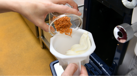 後日、NISSEIは自社キッチンで試食会を開催。いくつかのソフトクリームが提案されましたが、中でも一押しだったのはベビースターラーメンと北海道ソフトクリーム(ミルクソフトの中でも上位のプレミアムソフト)を混ぜ合わせたブレンダーソフト。これは他社にはない「ブレンドシステムフリーザー」だからこそできる、ベビースターラーメンの形態や食感を残したままブレンドしたソフト。まだ誰も食べたことのない未知のソフトクリームでした。