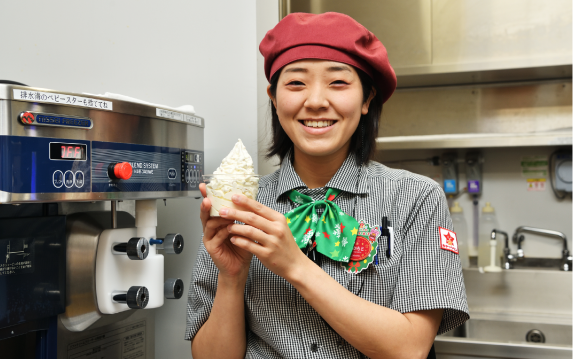私が担当する東海地区において株式会社おやつタウン様は話題性が高く、フードビジネス界においても注目の的です。ベビースターラーメンを使ったソフトクリームはもちろん弊社としても初めての挑戦で、みんなでアイデアを出し合いながら試作を重ねました。ベビースターラーメン風味のソフトや粉末にして練り込んだソフトなど様々なタイプを試しましたが、それではベビースターラーメンらしさが薄れてしまう。そこで弊社独自のブレンドシステムフリーザーを用いてベビースターラーメンをそのまま混ぜ込んだところ、意外な美味しさの発見につながりました。ベビースターラーメンのチキン味はパンチが強いため、ミックスには乳脂肪分が多くて味が濃い北海道ソフトクリームを合わせるとお互いの味を引き立て合うこともわかり、おやつタウン様に自信を持ってご提案できました。おやつタウン様の看板商品のひとつを一緒に開発できたことをとてもうれしく思います。小さな子どもたちが集まる施設だけに、今後も弊社としては安全面・衛生面を大前提に、おやつタウン様が掲げる「笑顔の時間」づくりに貢献すべく、最大限のサポートをしていきたいと考えています。