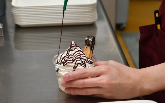 オープンが夏休みだったこともあり、ベビースターソフトクリームも連日行列ができるほどの大人気になりました。「えっ、ソフトクリームにベビースターラーメンが入っているの?」「意外と合うんですよ」「じゃあいっぱい入れてもらおうかな」とお客様は興味津々で「ごちそうさま。ホント美味しかった」とリアクションも上々。塚本さんらスタッフも確かな手応えを感じたといいます。また、取材に訪れた各メディアの反応も良く、「ベビースターソフトクリームはおやつタウンの看板商品に育っています」と浦さん。
