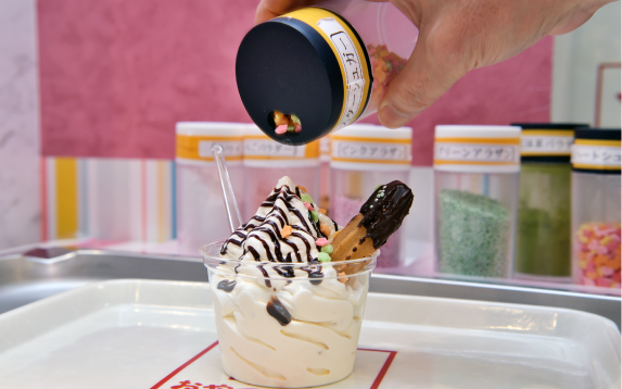 ところでベビースターソフトクリームを販売する「スイーツBar」の前には、自分で好みのトッピングができるコーナーがありますが、これはプレオープン時のオペレーションの中で偶然生まれたものだそう。当初はお客様にチョイスしてもらってスタッフがかけていましたが、待ち時間短縮のために急遽セルフサービスに。すると、そこで親子やカップルが笑顔で会話する場面が生まれ、セルフトッピングを定着させることにしたそうです。おやつタウンが何よりも大切にしているのは「笑顔」です。それは「おやつの時間」は「笑顔の時間」であり、その価値観が共通しているから。マッチングの意外性と驚きの新食感で誰もを笑顔にする「ベビースターソフトクリーム」は、「ここでしか味わうことができず、おやつタウンをアピールしていく上で大切な存在」(浦さん)です。2020年以降は感謝の気持ちを広く伝えるべく、おやつタウンの全国展開を計画中とのことですから、「ベビースターソフトクリーム」を試せるチャンスも増えそうです。