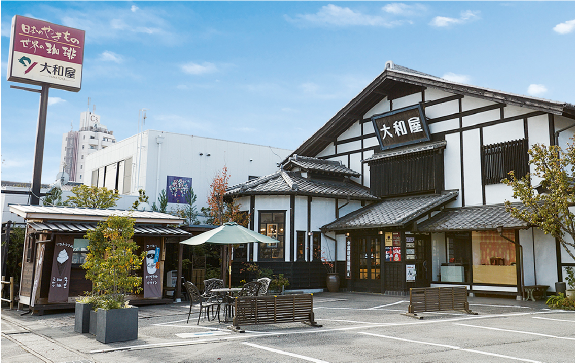 大和屋様は、群馬県のフードビジネス業界を代表する企業のひとつ。古民家風の建物の高崎本店は、地域のランドマーク的存在となっています。店内も和のテイストで統一されており、コーヒーの香り漂う落ち着いた雰囲気の中で、おうちカフェを楽しむための商品をじっくり選べます。