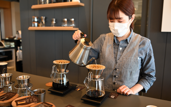 最新鋭のエスプレッソマシンを使い、カフェでしか飲めないカフェラテやドラフトコーヒーを楽しんでもらう一方、丁寧にハンドドリップで淹れたコーヒーは、同じコーヒー豆と器具を使えば自宅でも簡単に再現できるように体系化。“おうちカフェ”文化も広めていく啓蒙活動です。チーフバリスタの田中さんは「カッコよくスマートな振る舞いで美味しいコーヒーをご提供し、コーヒーの魅力やコーヒーのある豊かな日常に気付いてもらえるようなお店にしたい」と意気込んでいます。