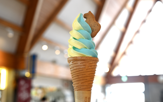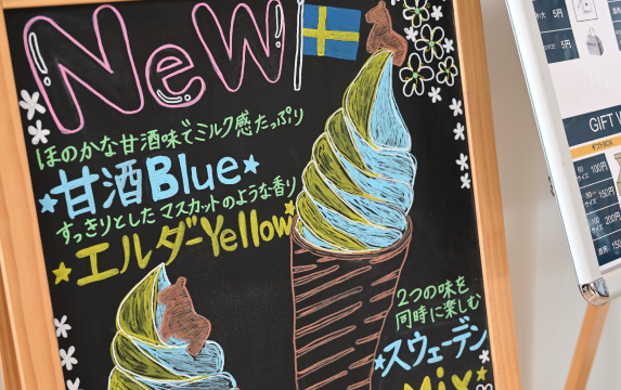 どのようなソフトクリームにするか。アイデアはスタッフの間から飛び出しました。「弊社は社長を除く全スタッフが女性で、思いついたことを気軽に言い合える雰囲気があります。北欧をテーマにした道の駅だからスウェーデン国旗の色にしようという提案が出ると、インパクトがあっていいねとみんなが賛同し、そこからは何を使ってどんな味にするか、わいわいと意見を出し合いました。」