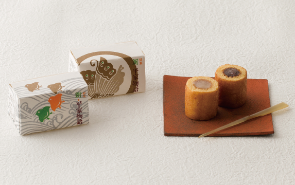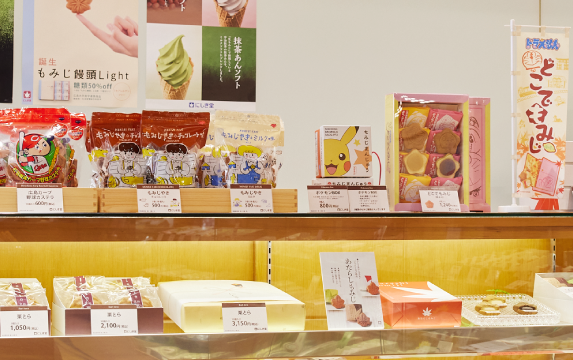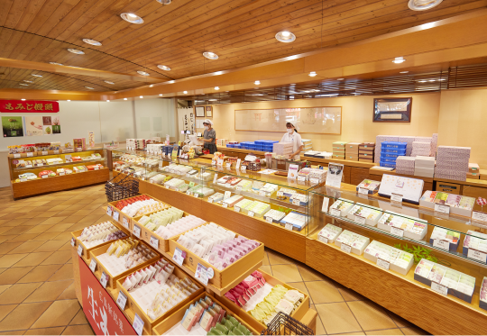 店頭には、もみじ饅頭や生もみじをはじめ、あん餅を抹茶生地で包んだ「おとなのもみじ」、和菓子の餡と洋菓子のバームクーヘンを組み合わせた「新・平家物語」などの看板商品がずらりと並び、一方では老舗の菓子舗らしく季節の和菓子も取り揃えられています。
