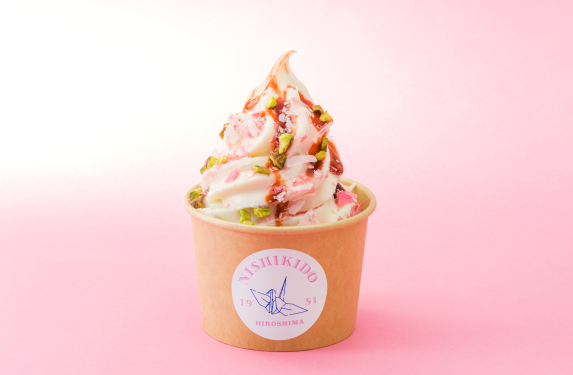 宮島店には、まずにしき堂らしさを象徴する「こしあんソフト」があり、次に宮島店限定の「白あんソフト」、こしあんと白あんの両方楽しめる「ミックスソフト」があり、こしあんソフトとミックスソフトには特製粒あんともみじやきをトッピングしたスペシャルカップもラインナップされています。そして、白あんソフトのスペシャルバージョンとして季節限定カップを販売。この春は「桜スペシャル」を、夏は「八朔スペシャル」を提供しています。
