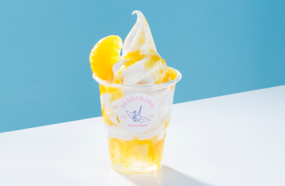 ソフトクリームはにしき堂の新事業分野として存在感を放ち始めます。まず、ソフトクリームの試作用にと本社にフリーザーのシングル機を導入。アイデアをすぐに試せるようにすると共に、新しいソフトクリームができると地元サンフレッチェ広島の試合が行われるスタジアムにフリーザーを運び込み、その日にしか食べられない1日限定のソフトクリームとして販売。お客様のダイレクトな感想を聞きながらソフト開発のノウハウを蓄積していきました。井上さんは「八朔ソフトやハニーキャラメルソフトなど、どれも完成度の高いソフトクリームだったので、限定にしておくのがもったいほどでした」と振り返ります。