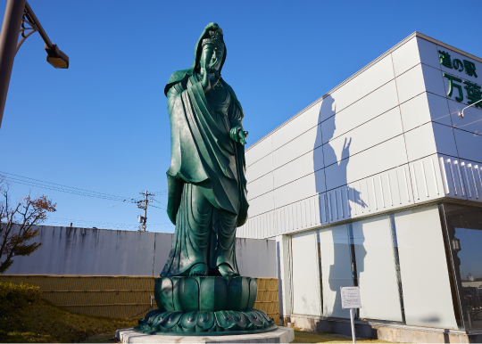 道の駅があるのは、能越自動車道高岡インターチェンジを降りてすぐの国道8号沿い。マイカーやレンタカーで高岡に訪れる多くの観光客が通る交通の要所です。道の駅を目的地に車を走らせていると、まず目に入るのが高さ約12mもある青銅色の大きな平和観音像。