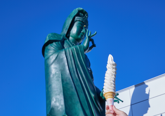 市民が復活を望む10段ソフトが大きな観音像のイメージとぴったり合致。道の駅ではもともとNISSEIのソフトクリームを扱っていたこともあり、10段ソフトを復活させるべくアイデアを日世に打診しました。