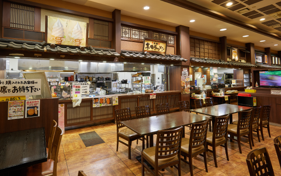 特産品コーナーの隣には、全120席を備えるフードコートを併設。2006年のオープン当初から、直径14cmもある「高岡大仏コロッケ」や万葉の里にちなんだシュークリーム「万葉シュー」、富山名物ブラックラーメンを筆頭に、レッド、ホワイト、ブラウンなど最大9色をラインナップした「カラーラーメン」など、ユーモアあふれるメニューを提供してきました。そして、平和観音像の移設をきっかけに新たな名物をと考案されたのが「観音10段ソフト」です。