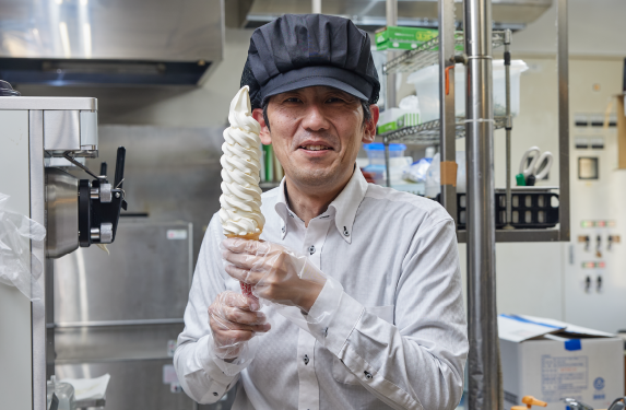 地域の魅力の発信拠点である道の駅は、オリジナル性やご当地性を色濃く出せることもあり、ソフトクリームとの相性はかなりいい施設だと感じています。道の駅 万葉の里 高岡様は、アイデア自体を皆様で出していただけるので、弊社としてはそれをいかに実現させるかに注力しています。フードコードでソフトクリームを提供しているという性質上、手の込んだことをするのは難しいため、誰でも簡単にできる、ここのオペレーションに適した形のものを提案するよう心がけています。例えば、ソフトクリームの提供が落ち着く秋口に、マロンや巨峰といった異なるフレーバーを販売してみるといった具合です。お客様自身でトッピングができれば、オペレーションの負担にならず、お客様も楽しめるので、10段ソフトの10万食突破記念にはぜひ実現させたい企画ですね。10段ソフトが“道の駅のもの”になったことは、道の駅の魅力づくりの一端を担えたと自負しています。