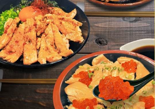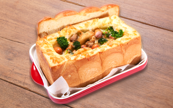 2022年1月には、「観音像に負けないインパクトのあるものを」と10段ソフトに続いて爆盛メニューが誕生。直径25cmのすり鉢に入った「キング富山ブラックラーメン」を皮切りに、豆腐丸ごと4丁を使い鍋に入れて提供する麻婆豆腐定食、ブランド卵・越のきらりが5個乗った卵かけごはん、地元の新ブランド牛・寿五位(すっごい)高岡牛を使った牛丼など、新メニューが続々登場しています。「何をデカくしたらおもしろいか、お客様にいかに喜んでいただけるかを基準に、スタッフみんなでアイデアを出し合っています」と大指さん。2023年2月には、地元の高岡商業高校とのコラボで「丸ごと2斤パングラタン」を開発。高校生のアイデアでは1斤だったのですが、もっとインパクトを出したいと2斤にしたそうです。2斤の大きさの食パンは、特注するというこだわりぶり。