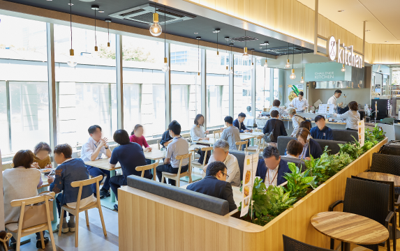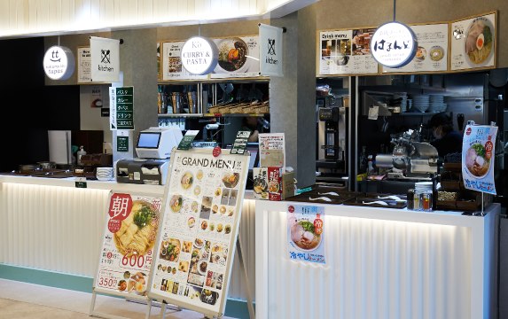 四国の「食」にフォーカスし、四国4県の食材や生産者・事業者の魅力を広く発信する「shikoku meguru」。店名には、お遍路さんが四国八十八ヶ所を巡るように、香川県・徳島県・高知県・愛媛県の各地の魅力あふれる「食」を巡ることができるような場所にしたいという思いが込められています。店内は、80席を備えるフードコートスタイルの飲食ゾーン「キッチン」と、四国各地の生産者や事業者のこだわりの商品を集めた物販ゾーン「マルシェ」に分かれています。2つのゾーンは一体となっていて、例えばマルシェで購入したおつまみを、キッチンでお酒と共に味わう、といった楽しみ方もできます。 また、キッチンの一角に設けられた「Challenge Kitchen」には、日替わりでさまざまな事業者が出店しているため、「訪れるたびに新たな出会いがある」と地域の人たちから好評です。