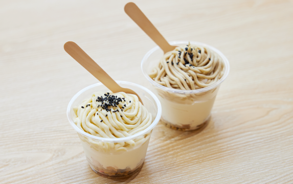 さらに、オリジナルソフトクリームだけでなく、四国の食材を使ったオリジナルのサンデーも開発。NISSEIの生乳ソフトに、徳島の鳴門金時、高知の四万十栗のクリームをモンブラン状にトッピングした2種類のサンデーがメニューに加わりました。「サンデーの開発にも苦労しましたね。特に四万十栗には泣かされました(笑)。栗のペーストは、渋皮が付いているものと付いていないもの、裏ごしがされたものとされていないものなど、何種類も試して、悩みに悩んで選びました」と天川さんは振り返ります。「開業日という期限が迫るなか、メニュー開発はもちろん、スタッフのトレーニングや店舗の販促物など、NISSEIさんが親身になってサポートしてくれて、とても心強かったです」。