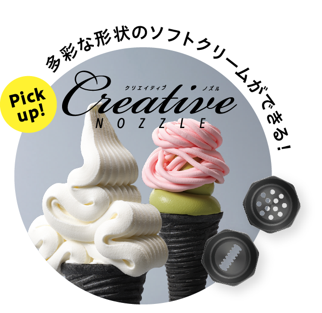 - ・個性的な形状のソフトクリームに盛れる「クリエイティブノズル」を標準装備。