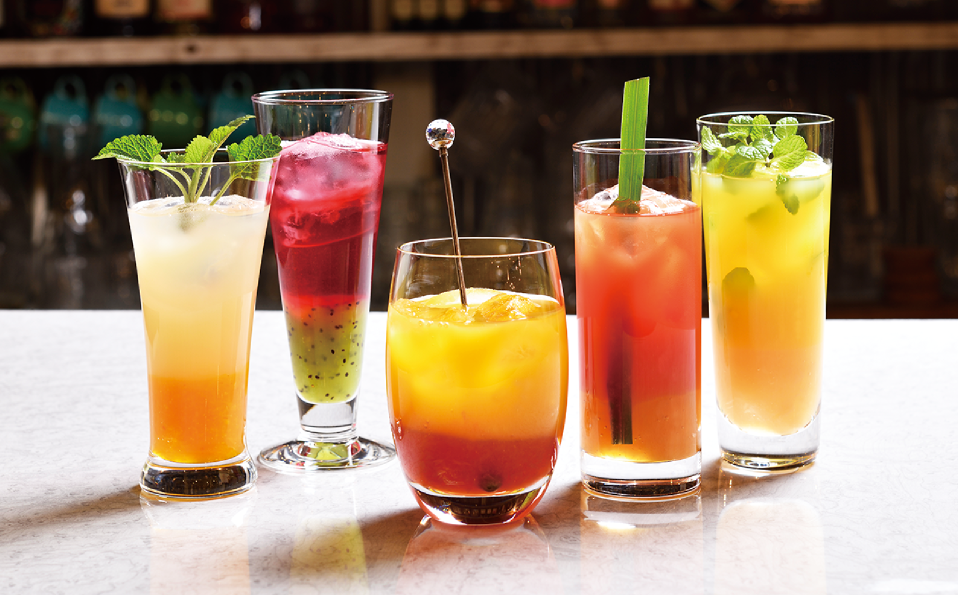 比重が大きい果肉入りドリンク用ベースはレイヤードづくりに最適。美しくて食感も楽しめるノンアルコールカクテルでオリジナリティー溢れるメニューを。