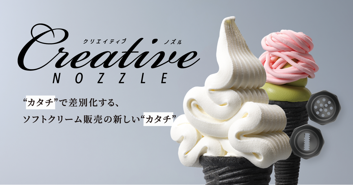 フリーザーの抽出口に、円形、三角形、星型など12種類の専用ノズルを取り付けることで、様々な形状のソフトクリームを提供できるオプション部品「クリエイティブノズル」が新発売!