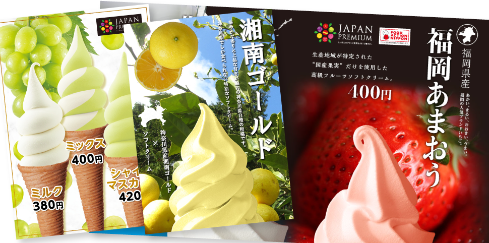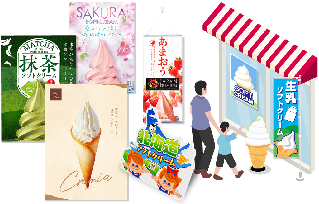 遠くからでもお店の存在がわかるサインやのぼり、食欲をそそるポスター、オススメのソフトクリームを訴求するパネルなど、ソフトクリームビジネスを支援する各種販促ツールをお店の環境に合わせて制作しています。