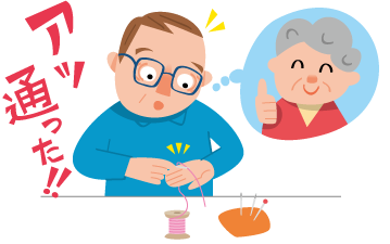針穴に糸を通す時は、手のひらに糸をのせ針穴部で糸を擦ると自然に糸が入るとの事。試して見たら「あら不思議」本当に入りました。(永吉くん さん/福岡県)