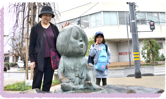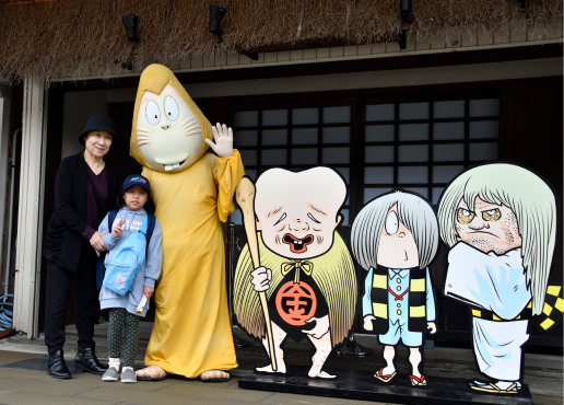 主人公の鬼太郎ブロンズ像と記念撮影。