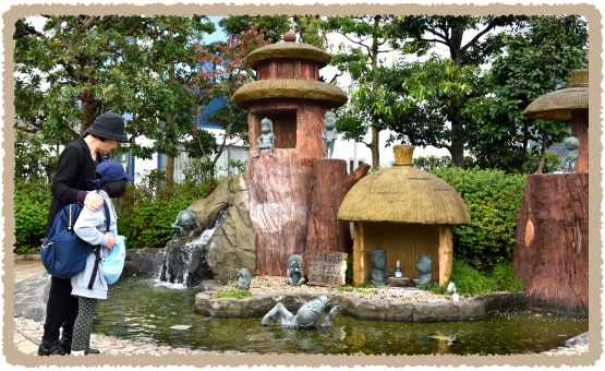 妖怪広場の一角にある「河童の泉」。切り株や小屋のまわりには、河童の三平や小豆あらいなど、水に関連する妖怪たちがいます。