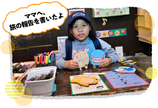 妖怪を描いた木製はがきに色を塗って、お手紙を書けば完成です。さよちゃんが選んだのは「べとべとさん」。お母さんにお手紙かな?