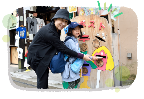 ポストに投函!はがきには投函口と同じデザインの消印が押して届けられます。おうちに届くのが楽しみだね。