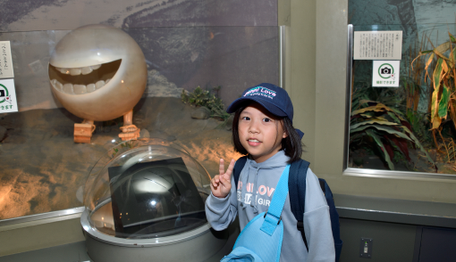 展望台フロアには、鐘を鳴らすと願いが叶うという「幸せのマリンベル」があります。さよちゃんはどんな願いをかけたのかな?