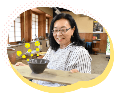 ギャラリーでショッピングを楽しんだ幸子さんとななちゃんは、夢幻庵備前焼工房で、作陶に挑戦。夢幻庵備前焼工房は伊部の龍王山南麓に位置する体験工房で、手びねりと電動ろくろによる作陶体験などが楽しめます。ななちゃんたちは、電動ろくろのヒダスキ焼成コース(指導付き)を選択!