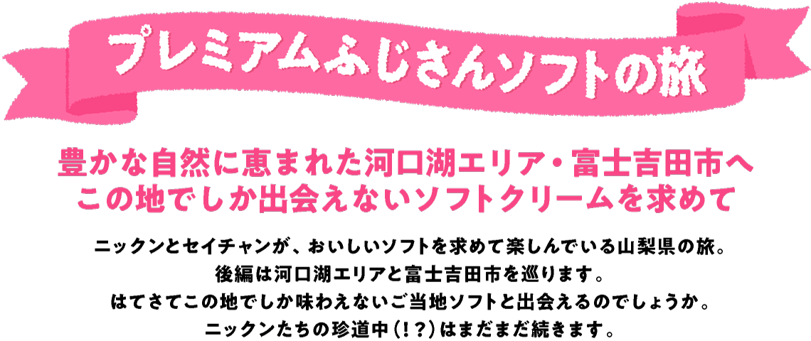 石和温泉駅からスタートし、笛吹市、富士河口湖町、富士吉田市を巡った旅もいよいよおしまい。楽しいスポットをたくさん巡り、おいしいご当地ソフトとも出会うことができました。ニックンたちはまた一つ素敵な思い出が増えて幸せいっぱい!です。