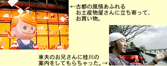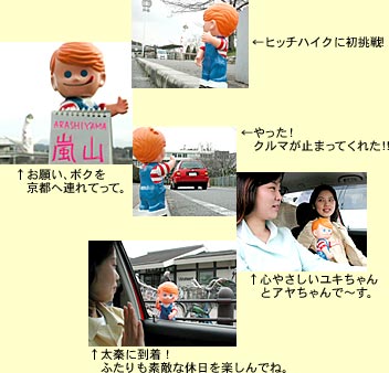 乗せてくれてありがとう。やさしい女の子は、ユキちゃんとアヤちゃん。二人は幼なじみで、今日は京都の太秦の映画村へ遊びに行くんだって。