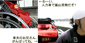 人力車で最後に到着したのが桂川の河畔。「あちらに見えますのが、新緑の小倉山でございま〜す」。人力車って、楽ちんでとっても楽しいね。はっぴ姿がカッコいい車夫のお兄さん、ありがとう。