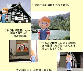 やってきたのは天竜寺。ここは、足利尊氏が建てたお寺で京都の中でもとくに格式の高いお寺なんだよ。回遊式のお庭も有名で、世界文化遺産にも指定されているんだ。