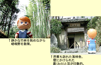 嵯峨野の竹林を見ながら、次は落柿舎へ。松尾芭蕉のお弟子さんの向井去来という俳人が住んでいた庵。芭蕉もここで『嵯峨日記』を書いたんだ。庵の中には投句箱もあるから、旅の思い出に一句ひねるのもいいかも。