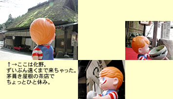 嵯峨から念仏寺で知られる化野へ。山里らしい茅葺き屋根の茶店で小休止。おいしい桜餅とお抹茶をいただいて、ふたたび嵐山に向かってUターン。