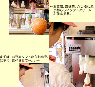 それでは、さっそく嵯峨名物のお豆腐を使った「お豆腐ソフト」をいただきます。さすが、京都らしい上品なおいしさ! 抹茶や八つ橋ソフトも食べちゃおう!!