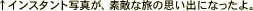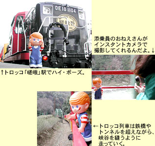 保津峡のすばらしい眺めを楽しみながらトロッコの終点「亀岡」駅へ。車内ではインスタントカメラのサービスで旅の思い出をパチリ! ヒッチハイクや人力車、トロッコ列車と、初体験がいっぱいの小旅行もそろそろ終わりに近づきました。この次もまた、おいしいご当地ソフトの旅をいっしょに楽しもうね。