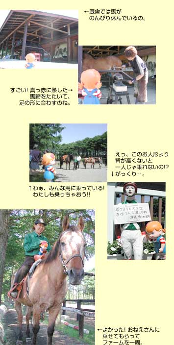 せっかく牧場へやって来たんだから乗馬にチャレンジしなくちゃ。ところが、一人で乗るには身長が低すぎるんだって。そこで、スタッフのおねえさんといっしょに乗ることにしたの。のんびりファーム内のコースを一周。お馬さんとも仲良しになれたわよ。