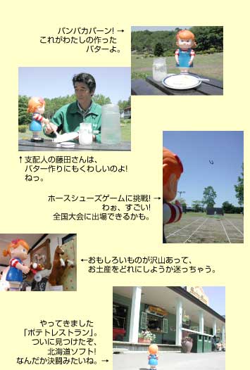 さぁ、いよいよ今回の旅の最後の目的、「北海道ソフト」が食べられるポテトレストランに。ソフトクリームコーナーで迎えてくれたのは村松昌枝おねえさん。おなじ日高の牧場で作られた牛乳をたっぷり使った「北海道ソフト」は、まさに北海道の味! 広々とした牧場を眺めながら味わうと、さらにおいしく感じちゃう。