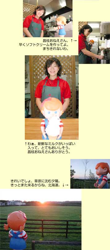 子馬と遊んだり、バターづくりにチャレンジしたり。ほんとに楽しかったケンタッキーファームの一日。すばらしい牧場の夕陽を背景に、今回の旅もそろそろエンディング。おいしいご当地ソフトややさしい人たちと出会わせてくれてありがとう、北海道。また、来るからね。