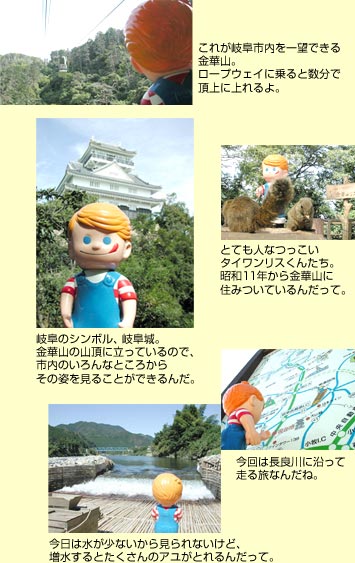 岐阜といえば金華山。標高329メートルの山頂には岐阜城がそびえ立っているんだ。ロープウェイに乗って岐阜の町並みを一望。リス公園ではかわいいタイワンリスといっぱい遊んだぞ。