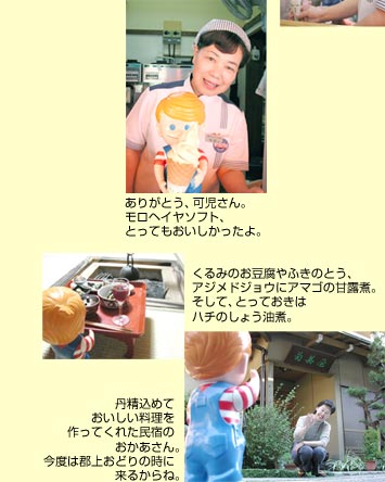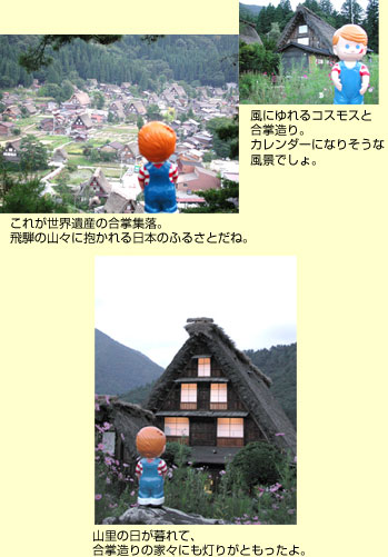 「パスカル清見」からは一足のばして白川郷へ。世界遺産にも指定されている合掌造りで有名な白川郷を訪ねるのはボクの夢だったんだ。4階もある大きな家の中で昔の人たちがどのように暮らしていたのか知りたくなるよね。でも、飛騨の山々の向こうに日が沈み、灯りのともった合掌造りを眺めていると、なんだかお家に帰りたくなっちゃった。おいしいご当地ソフトに出会い、山や川の幸を味わった美濃・飛騨路の旅もそろそろエンディング。秋の日本を心ゆくまで楽しんだ素晴らしい旅だったよ。