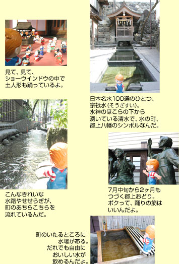 二日目は街の散策からスタート。ここ郡上八幡は街のどこを歩いていても水の流れる音がきこえる清流の里。町中にはいくつもの水場があっていつでもおいしい湧き水を飲むことができるんだ。吉田川ではアユやアマゴが釣れ、夏になると橋の欄干から川に飛び込む子どもたちで大にぎわい。時にはオオサンショウウオと出会うこともあるんだって。