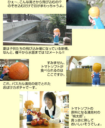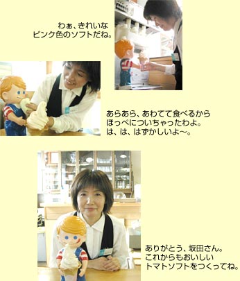 日本のトマトを代表する“桃太郎”の一大産地ということで生まれた「パスカル清見」のトマトソフト。完熟トマトならではのゆたかな風味をそのまま活かした、とっておきのご当地ソフトである。果肉をいったんジュースに仕上げて使用しているため、バニラソフトとのブレンドも洗練されておいしい。また、口に広がる香りは、太陽の光をいっぱいに受けて育ったトマトの風味を思い起こさせてうれしい。とくにパスカル清見の緑に恵まれたロケーションの中で食べる味は別。まさに、ご当地の自然の中でゆっくりと遊んだあとに味わいたいソフトクリームである。