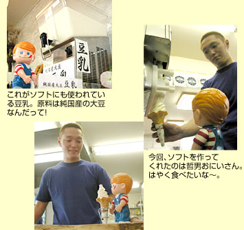 昭和41年から営業をつづける喜興門(きよもん)豆腐山崎豆腐店の姉妹店だけあって豆腐関連商品が充実。もちろん、ソフトクリームに使用する豆乳も厳選された純国産の大豆のみを使用したこだわりの品。さっそく豆乳ソフトを試食してみて、バニラソフトと豆乳の相性の良さにびっくり。バニラの味がよりまろやかに、上品になって口の中に広がる。
