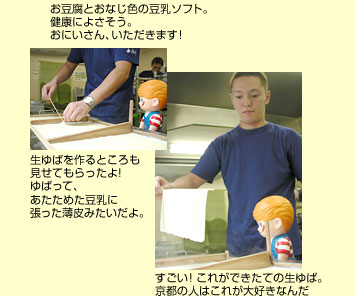 さて、いよいよ今回の旅のひとつ目の目的、豆乳ソフトをもとめて大宮通りを南へ。二条城から歩いて5分ほどのところに山崎豆腐店を発見!! このお店は、同じ三条ショッピングストリートにある喜興門(きよもん)豆腐山崎豆腐店の大宮店としてオープンしたんだって。ソフトクリームのほかにもいろんなヘルシー食品がならんでいるよ。