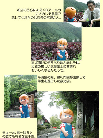さて、午後からはバスで八瀬花尻へ。ここにある「志ば漬の里」でふたつ目のご当地ソフト、志そソフトが食べられるんだ! わぁ、お店の中にはいろんなお漬け物がいっぱい! さらにうらには志ば漬に使うしそ畑があるぞ!! そうか、このしそを使って志そソフトクリームができるんだ。ああ、早く食べてみたいよ。