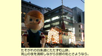 今夜は祇園祭の宵山。たそがれの四条通は見物の人でいっぱい!コンチキチンと街に響くお囃子(はやし)を聞きながら、そろそろ京都の街ともお別れだね。今回は、京ならではのご当地ソフトに出会い、古都のいろんな顔を満喫した楽しい旅でした。