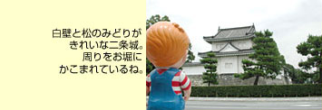 ふたたびバスにのって、七条界隈から二条へ。ふつうのお城と比べると低い建物だけど、徳川家康はここから大坂夏の陣に出たんだよ。